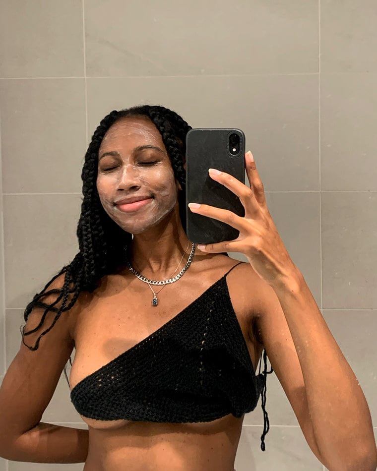 Black soap for my body and my face. Another essential is the Dark Spot Serum from Eadem. I love it, I'm on my second bottle. I use that every day, morning and night. I also love using sheet masks. They’re the best for clearing your skin and getting rid of any irritation or discoloration. I like to use Cocokind’s sunscreen. I’ve always had a tough time finding sunscreen before there were many natural options. I was allergic to chemical sunscreen and I would break out in high school, but it was hard because even if you have [a lot of] melanin, you do still have to protect your skin and I wasn't protecting it for so much of my life until this past year after I found the right one. This sunscreen is amazing because it doesn't have a bad white cast, which is amazing for having brown skin. For my lips, I use Belief’s Aqua Bomb Lip Mask and it feels really amazing. I love having hydrated lips, that’s very important for me.