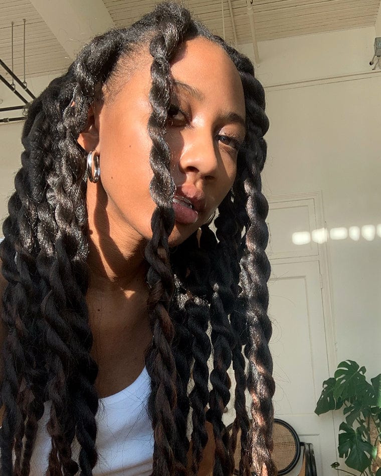 Every three-ish weeks. I try to give my hair a break in-between and give it a deep wash. Also, a couple of times a year I like to do an apple cider vinegar rinse and really clean my scalp. In between braiding, I’ll just twist my hair with water and castor oil. I like to keep it simple.