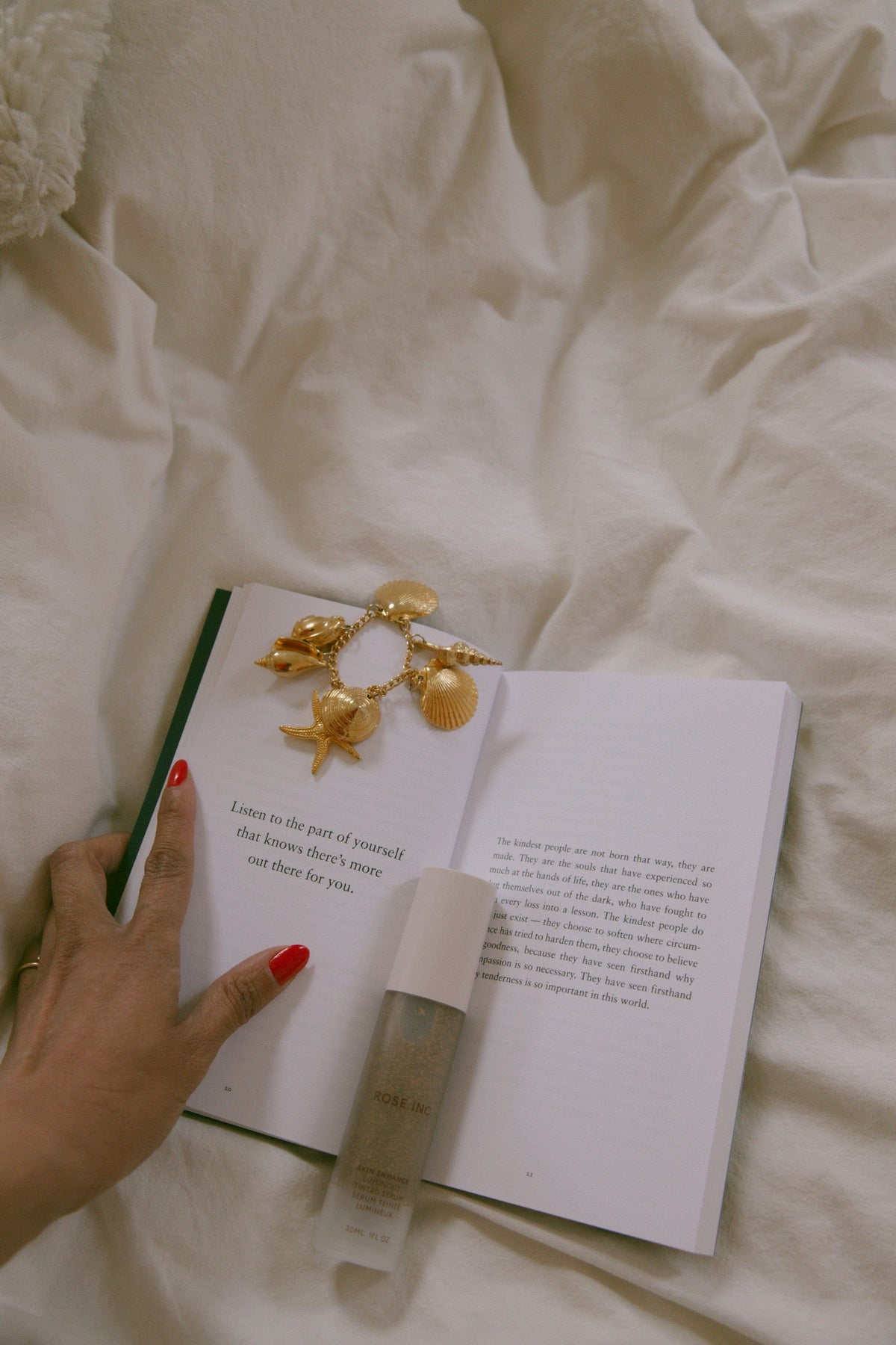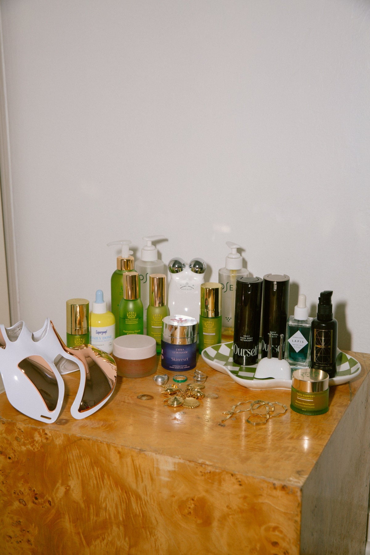 I'm constantly trying different skincare products, but currently in the morning I use an oil-to-milk cleanser, then a LED mask. It was a splurge and it makes me look like Iron Man, but I'm obsessed with it! I’m on month three of using it and have noticed less hormonal pimples. After the LED mask I spray my face with a nourishing essence, then apply a vitamin C eye serum and face cream. I like to use Rose Inc’s microencapsulated moisturizer and top it off with an oil-based sunscreen. At night I double cleanse. Afterwards I use my NuFACE Trinity followed by my LED mask again. Next I apply a biomimetic serum, spot treatment and a renewal cream, and cap my night routine with facial oil. On my body, I love a salt scrub in the shower and oils post shower. Sometimes I apply them on my eyebrows too. I recently got eyebrow lamination and I read somewhere it’s good for aftercare. Once a week I use resurfacing masks.